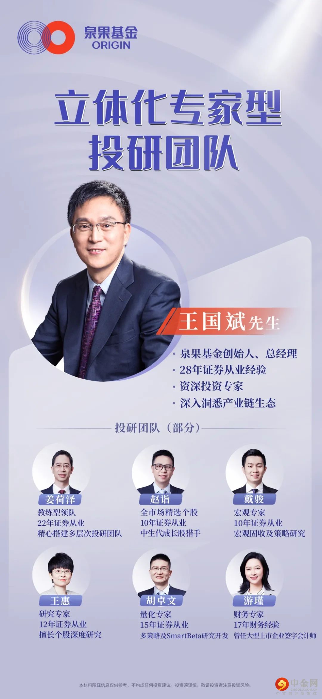 泉果基金创始人、总经理;2019-2022 年任国家制造业转型升级基金投协会委员;君和资本联合创始人;东方红资产管理创始人;曾任东方证券副总裁,多年深耕自营、证券研究所及资产管理;曾任职于中经开证券交易部、万国证券投行部等。王国斌具备28 年证券从业经验,国内证券市场入行最早的专业投资人之一,穿越A股市场多轮牛熊周期,始终坚守在资本市场一线。资深投资人,领衔东方证券资管部及东方红资管11年,带领的投资团队长期业绩优异,培育了一批中国优秀的中生代基金经理。