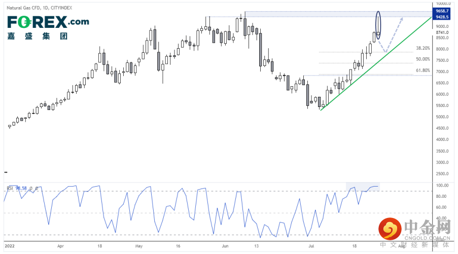 天然气日图价格强力反弹,目前在6月高点附近,但似乎后继无力。日图K线接近于看跌pinbar,警告修正潜力。RSI (2)同样严重超买。逆势交易者可考虑下看上升趋势线,而趋势交易者可在价格向该趋势线回撤时寻找做多机会。