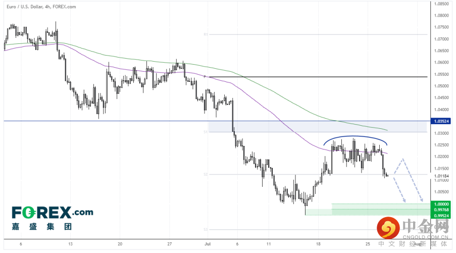 欧元/美元4小时图交投于下跌趋势中,但目前处于修正阶段。价格继续低于200和100期指数移动均线,并可能形成筑顶形态。欧元/美元此前在月图第2支撑中枢企稳,打开小级别反弹的空间。前述筑顶形态的测量目标在0.9978附近,空头重点关注平价下方的支撑区域。