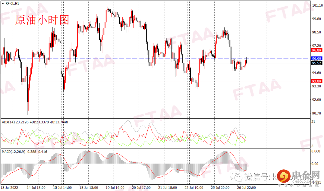 原油周二冲高回落下跌,最高98.96,最低94.78,日图收出长上影小阴,显示短期多头再度发力后,被空头逆转,日图级别或维持震荡偏空。欧盟国家同意在今年冬天减少天然气的使用,并延长对俄制裁时间,油价昨日亚盘反弹,欧盘震荡后,持续下行。小时图MACD指标已经翻绿。日内或维持震荡偏弱。今早亚盘油价维持震荡。操作上可持有空单,或逢高在96附近轻仓空,止损96.80,目标93.80。