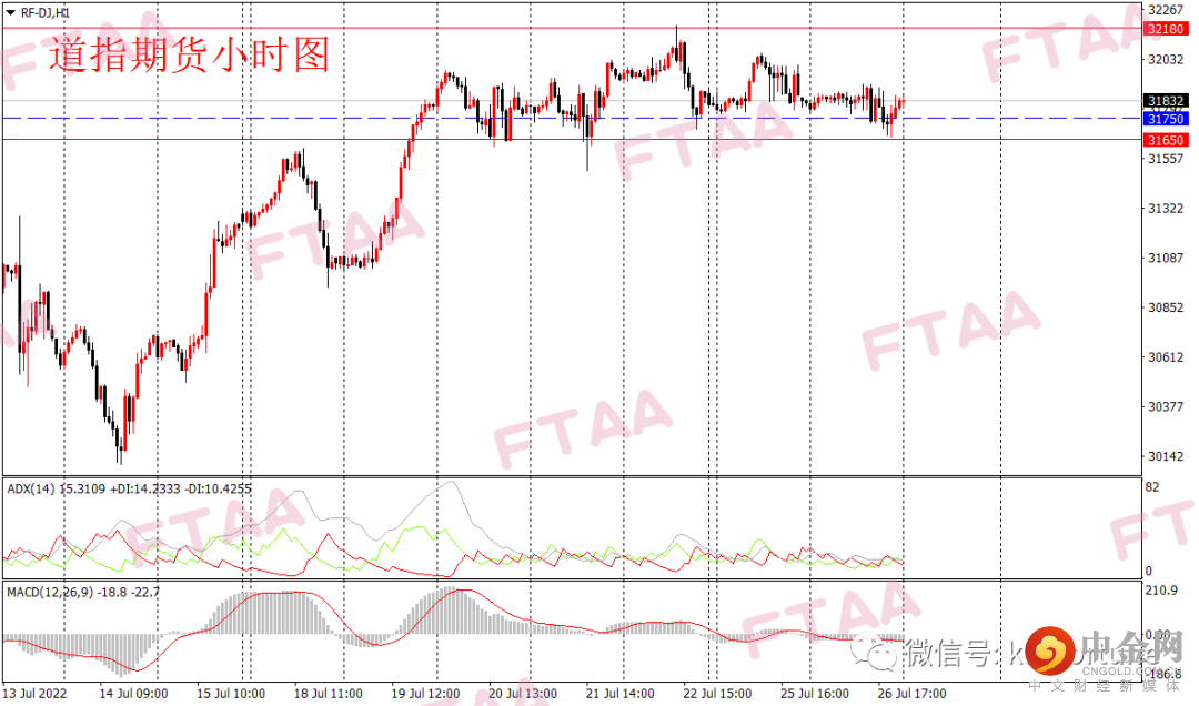 周二美股三大指数集体下跌,纳指跌近2%,道指跌228点或0.71%。美国7月份消费者信心指数创5个月新低,此外沃尔玛下调利润预期带动零售股大跌,加剧了人们对消费支出不足导致经济衰退的担忧。道指低开震荡走低收跌,日图收出小阴线,显示日内空头主导,价格跌破5日线,短线或维持调整。道指期货方面,昨日亚欧盘窄幅震荡,美盘时段小幅下跌,但小时图级别整体仍维持震荡。考虑到美联储利率决议公布在即,市场或维持窄幅波动。今早亚盘道指期货小幅上涨,操作上可持有多单,或逢低在31750附近轻仓多,止损31650,目标32180。