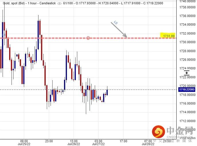 根据美国商品期货交易委员会(CFTC)数据数据显示,7月19日当周是连续第二个星期出现黄金期货净淡仓盘,是自2019年5月以来的第二次。数据显示出7月19日当周黄金期货好仓盘减少了613张至91,056张合约,与此同时,黄金期货淡仓盘则增加了11,992将至109,794张合约,因此,7月19日当周出现18,738张黄金期货净淡仓盘合约,这数字反映出投资者对黄金价格后市有一段时间难以展现出大幅攀升走势的预期。假若联储局在今晚稍后时间的议息会后声明呈现出更积极的加息取态方向的话,金价有机会要反复下试$1,700美元水平的支持力。