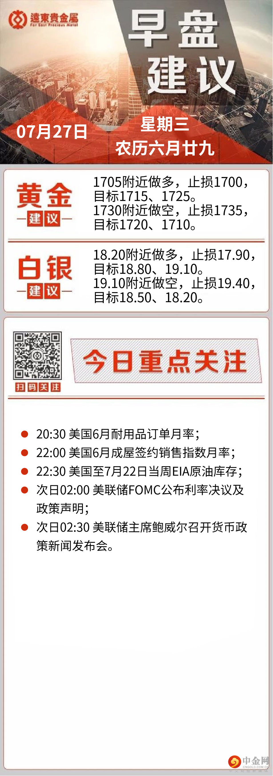 展望日内重点关注次日02:00,美联储将公布7月利率决议结果,目前市场大多预计会加息75个基点。此外在进入静默期之前,美联储最鹰的FOMC票委、圣路易斯联储主席布拉德以及亚特兰大联储主席博斯蒂克均表示赞成加息75个基点。另外次日02:30,美联储主席鲍威尔召开货币政策新闻发布会。此前他曾多次重申让通胀回落到2%的承诺。还有需要提醒的是,美联储利率决议前,市场还将迎来美国6月耐用品订单月率初值,该数据对金价的影响力还比较大,目前市场预计环比下降0.4%,5月为增长0.8%,该数据预期略微利好金价;如果数据差于预期,则有望给金价提供一些上涨动能。如果意外大幅好于预期,则短线料将拖累金价表现。