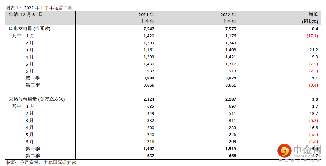 公司公布略显平淡的2022年第二季度运营数据(见图表1),风电发电量同比下跌0.4%至3,651吉瓦时,换言之4-6月同比增长率分别为+9.3%、-7.9%、-2.5%。我们归因于期内风资源偏弱。