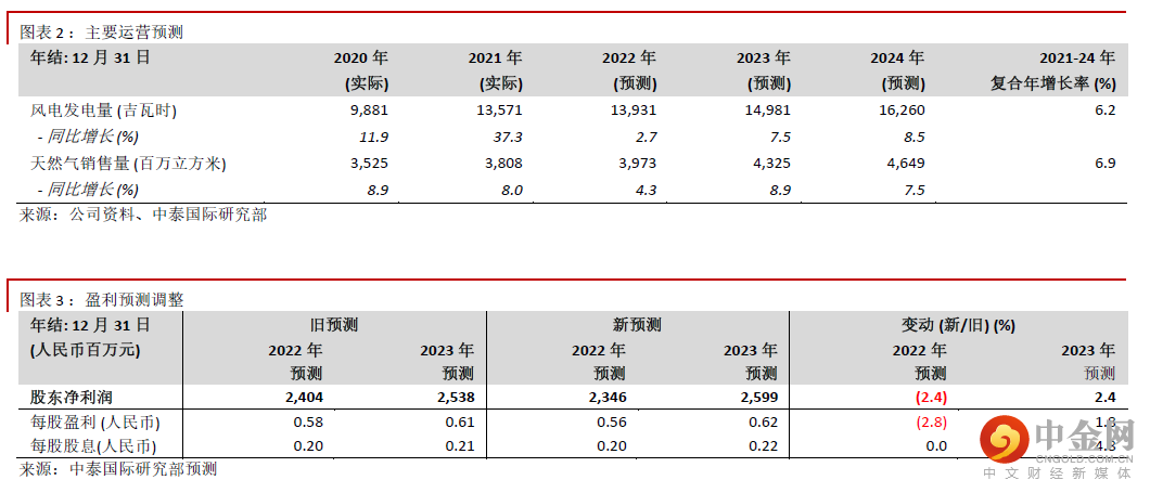 我们预计第三季度仍会不明朗,该季是风电行业的传统淡季。第四季度则会回暖,因为疫情及地缘政治因素届时将会逐步稳定下来,支持能源需求增长。预计2022年全年风电发电量及天然气销售量将分别同比上升2.7%及4.3%至13,931吉瓦时及3,973百万立方米(见图表2)。