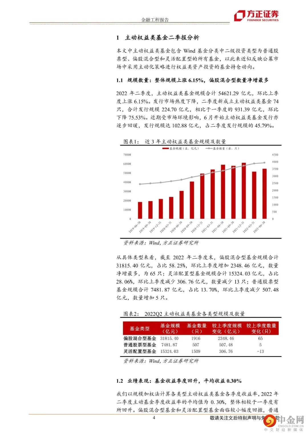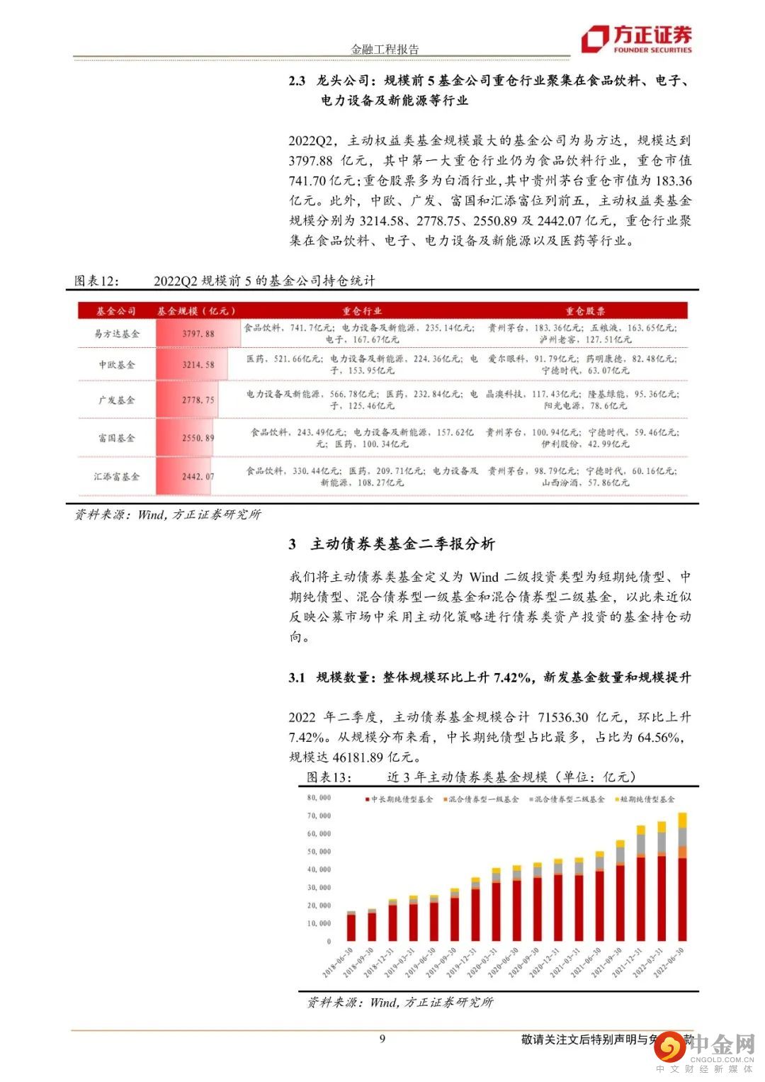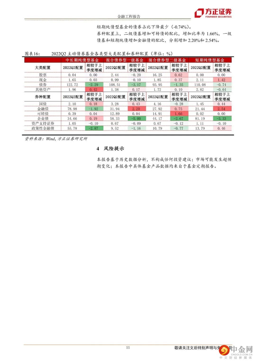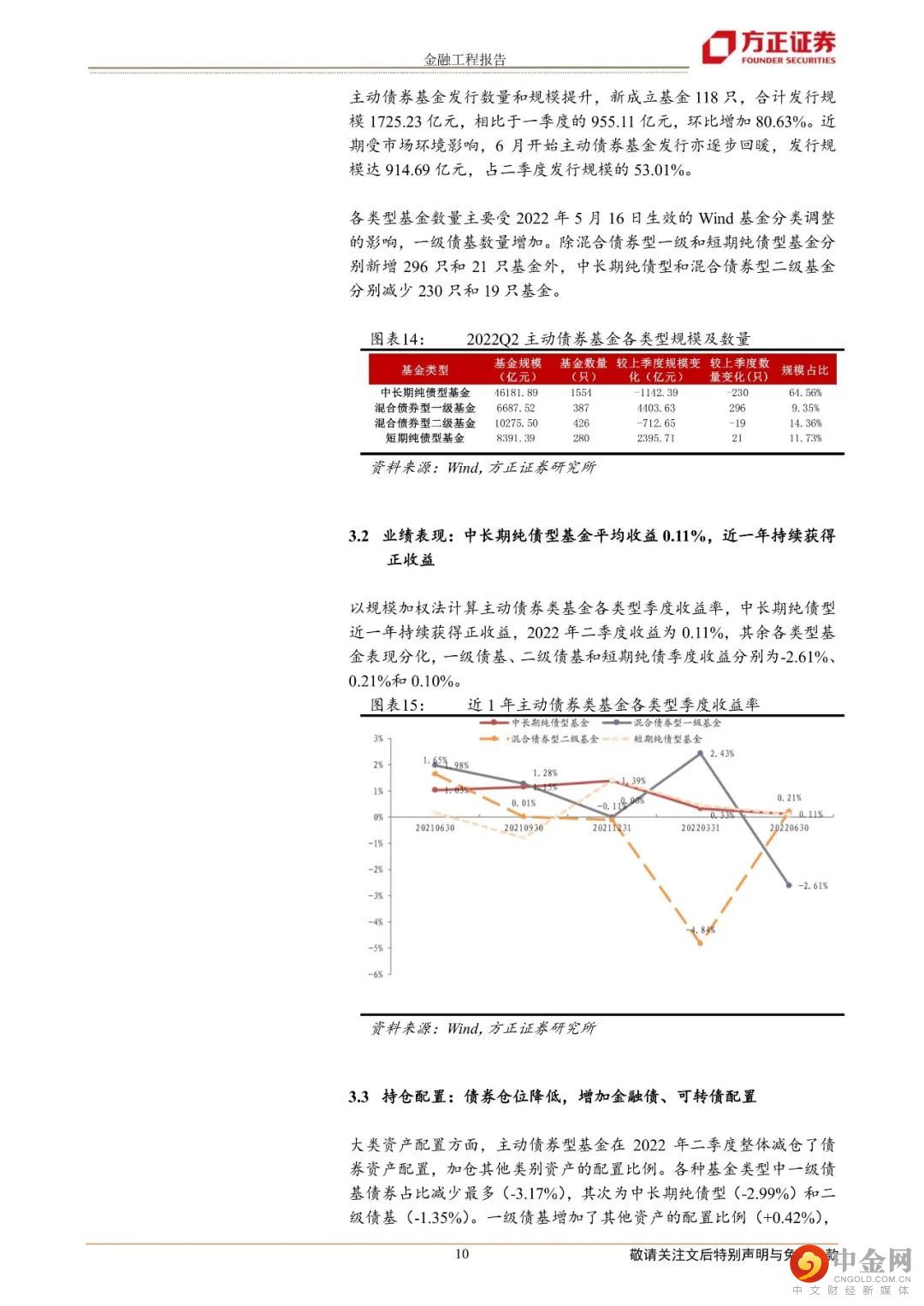 三、主动债券类基金二季报分析1.整体规模环比上升7.42%,新发基金数量和规模提升;2.中长期纯债型近一年持续获得正收益,为0.11%,其余各类型基金表现分化;3.整体减仓债券资产配置,加仓其他资产的配置比例。券种配置上,增加金融债、可转债配置。风险提示:本报告基于历史数据分析,不构成任何投资建议;市场可能发生超预期变化;本报告中具体基金产品数据均来自于基金定期报告。