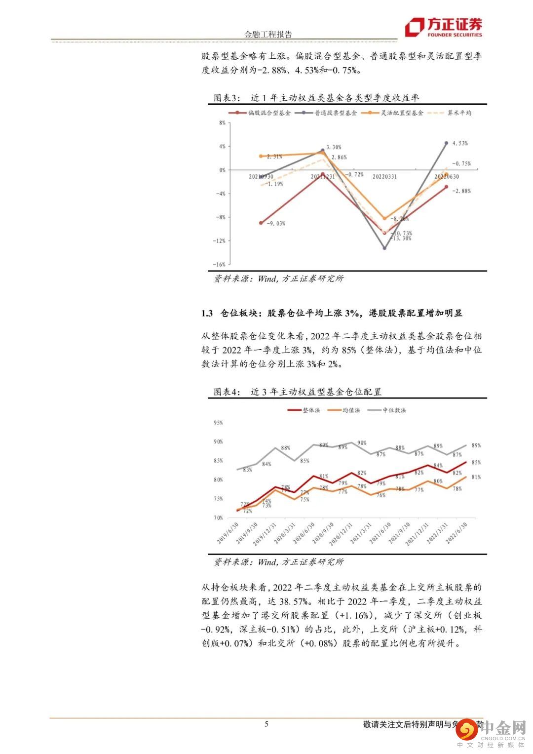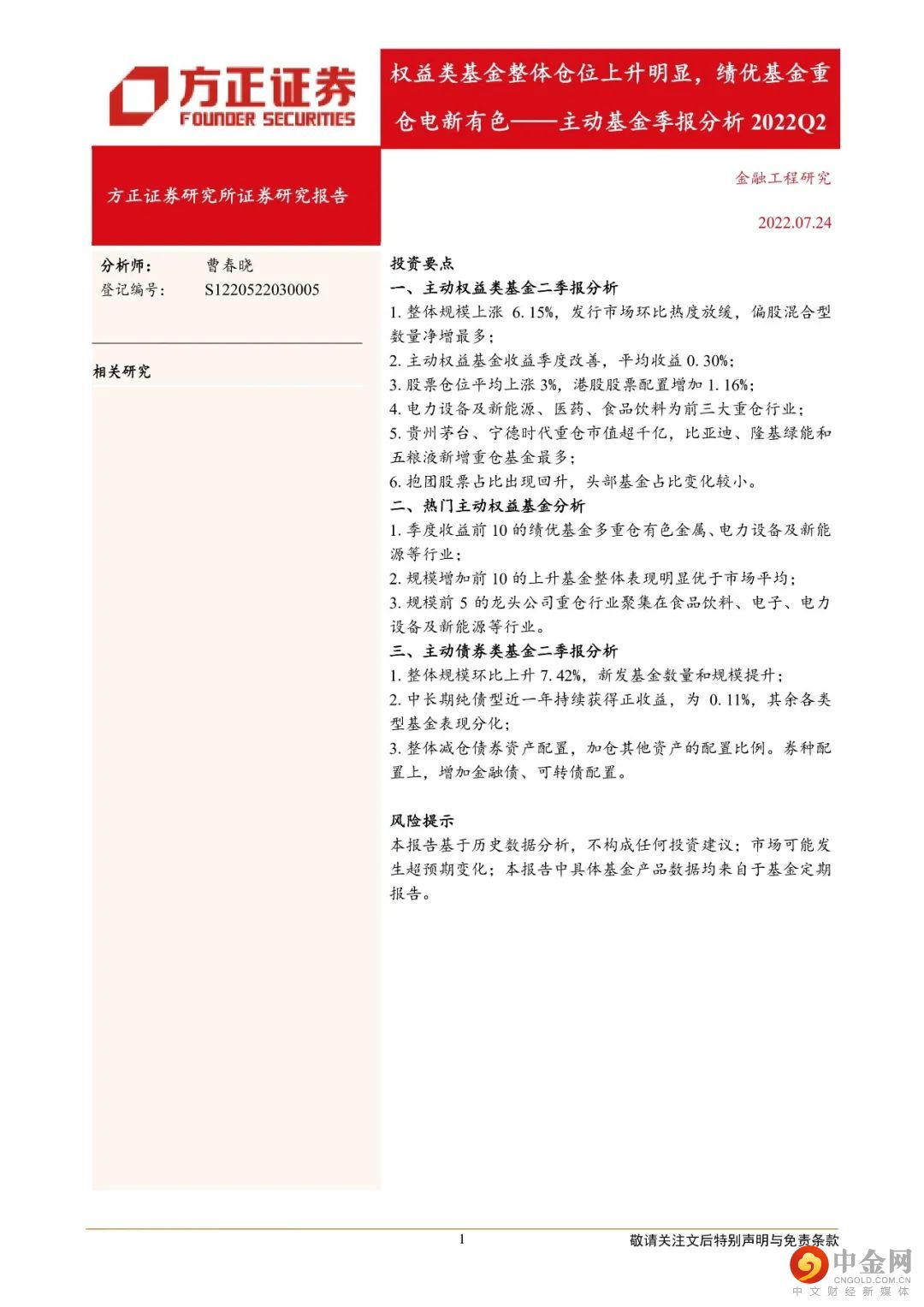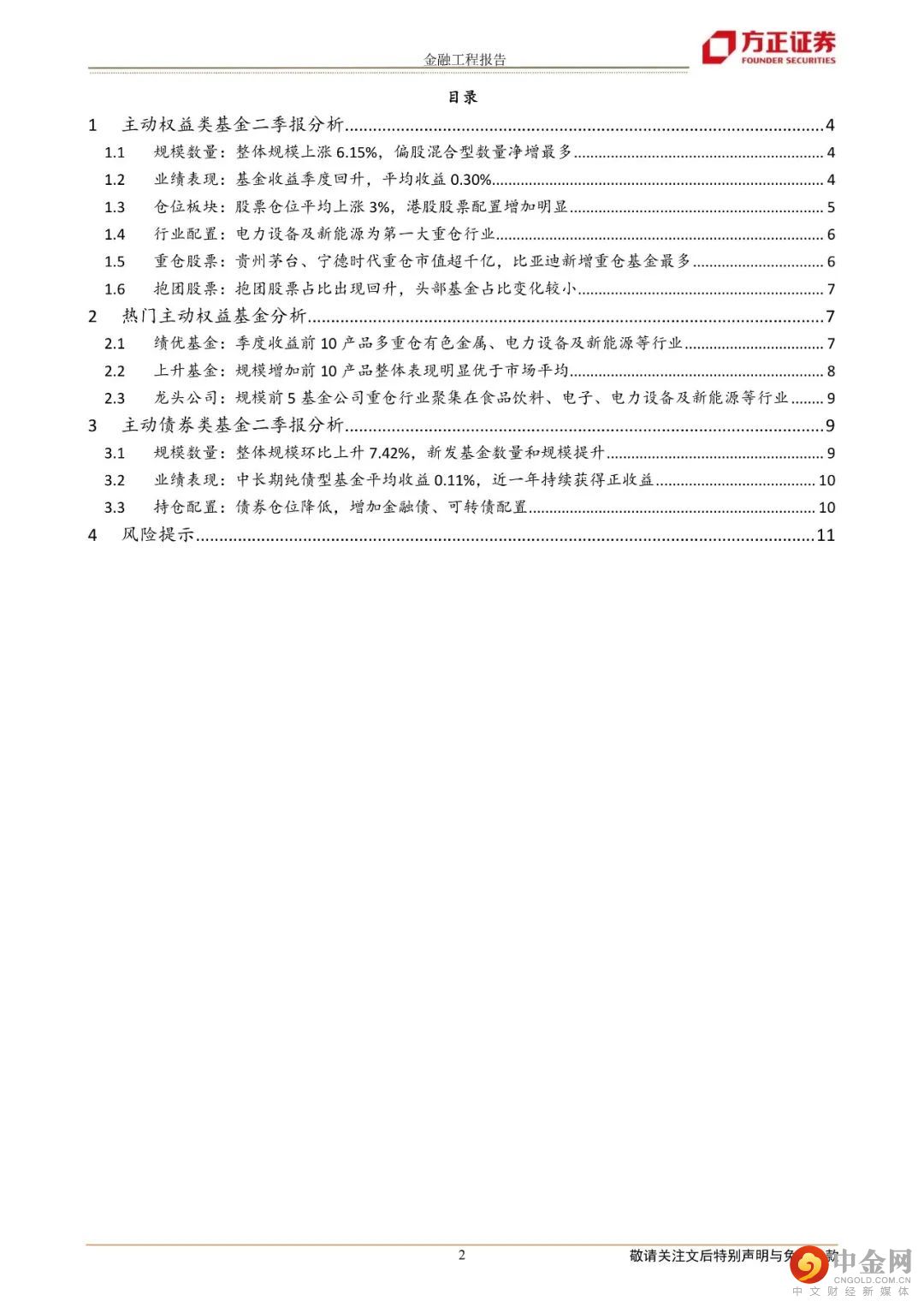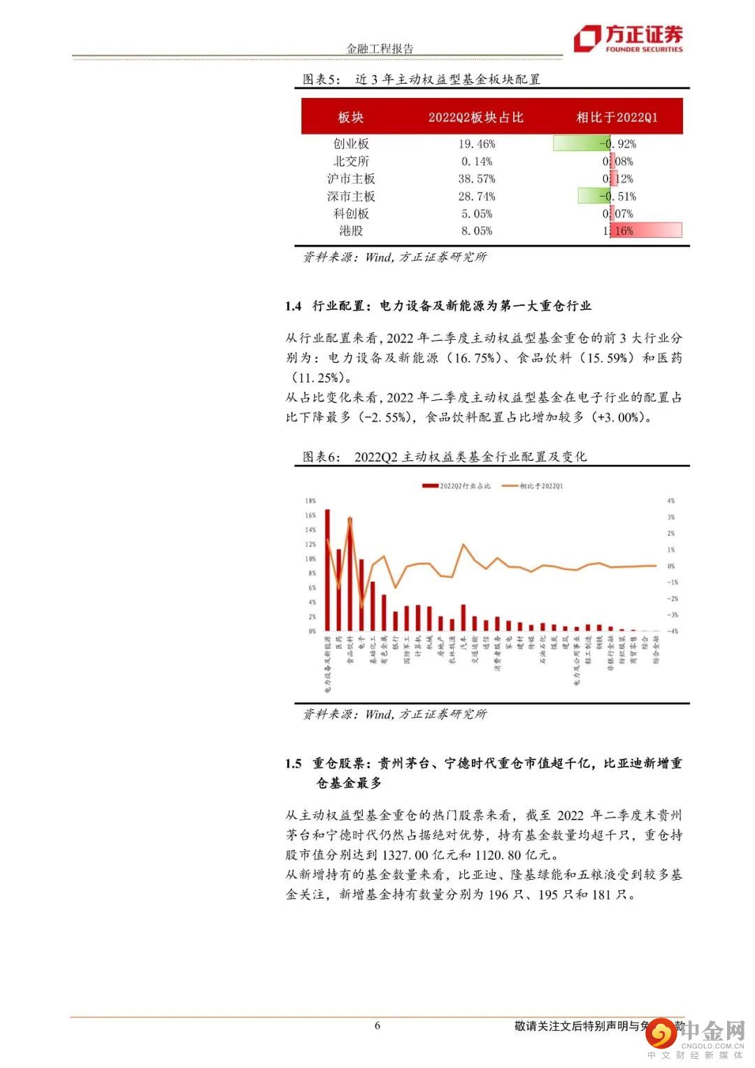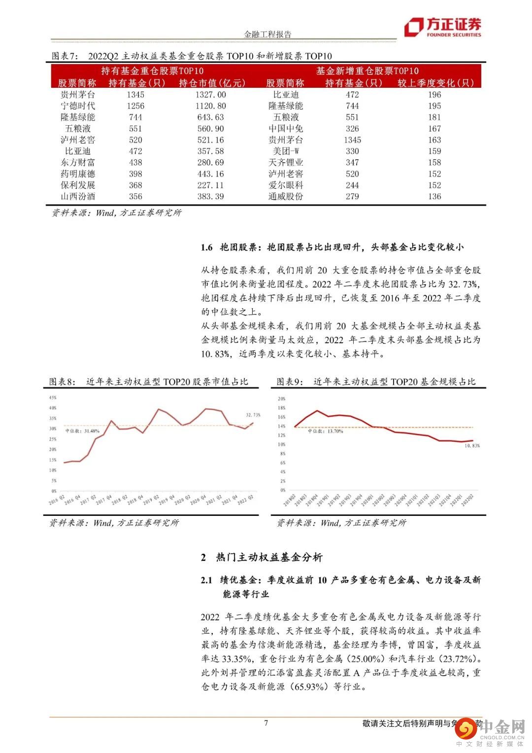 一、主动权益类基金二季报分析1.整体规模上涨6.15%,发行市场环比热度放缓,偏股混合型数量净增最多;2.主动权益基金收益季度改善,平均收益0.30%;3.股票仓位平均上涨3%,港股股票配置增加1.16%;4.电力设备及新能源、医药、食品饮料为前三大重仓行业;5.贵州茅台、宁德时代重仓市值超千亿,比亚迪、隆基绿能和五粮液新增重仓基金最多;6.抱团股票占比出现回升,头部基金占比变化较小。