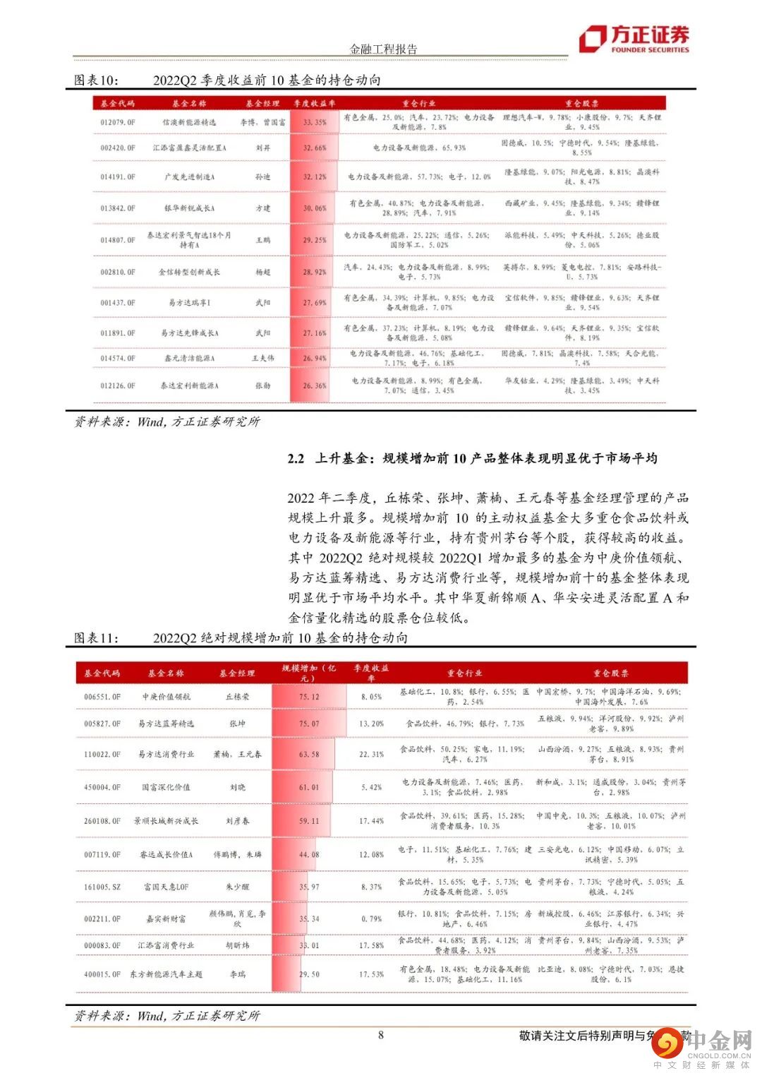二、热门主动权益基金分析1.季度收益前10的绩优基金多重仓有色金属、电力设备及新能源等行业;2.规模增加前10的上升基金整体表现明显优于市场平均;3.规模前5的龙头公司重仓行业聚集在食品饮料、电子、电力设备及新能源等行业。