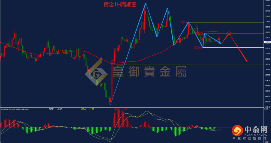 从黄金1H周期图来看,前期行情在低位形成V型反转,冲高至1739一线后,多头动能明显衰减,近两天行情呈现出高低点同步下移的震荡偏空格局。目前金价处于60均线下方运行,MACD也处于0轴下方运行,空头趋势较强。日内关注上方压力1721.5、1728,下方支撑1713.5、1704,操作上建议反弹做空为主。
