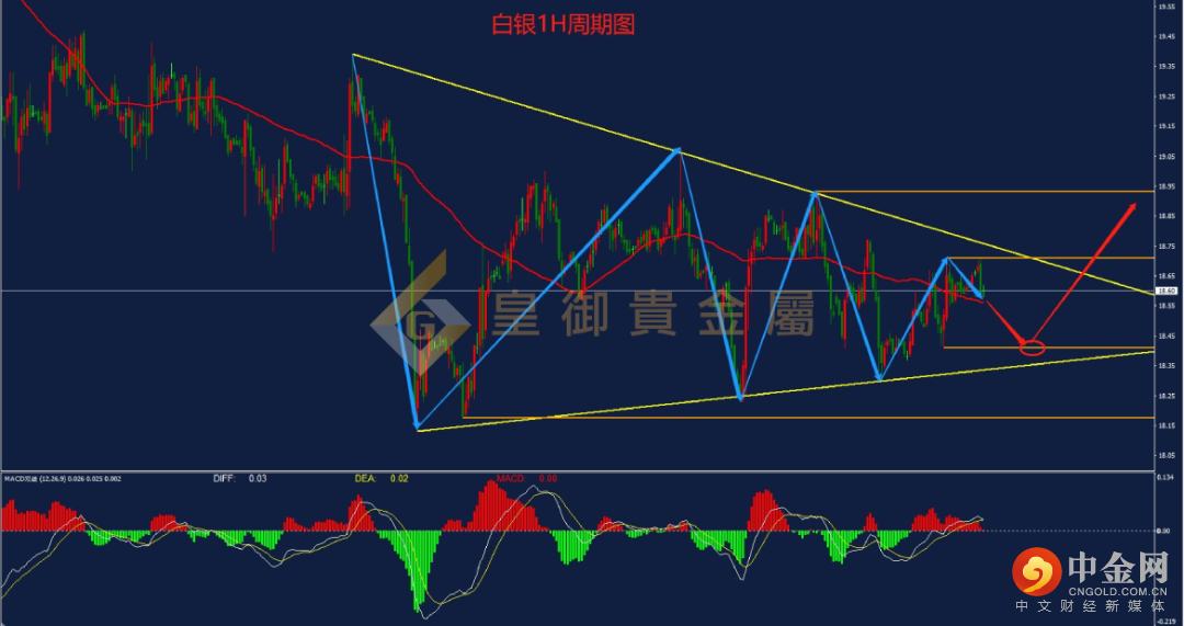 从下方白银1H周期图看,前期行情经历一波大跌后,近期一直维持在低位作区间宽幅震荡整理,整体走势呈现出高点逐步下移,低点逐步上移,振幅不断收窄,目前行情处于三角型整理末端,多空争夺激烈。日内关注上方压力18.71、18.93,下方支撑18.41、18.18,操作上建议围绕区间压力位和支撑位作高抛低吸为主。