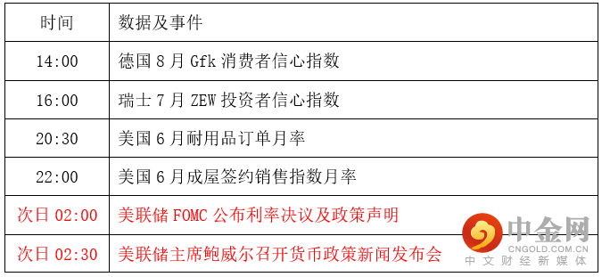 多数投资者等待周四凌晨的美联储利率决议,市场普遍预期美联储将降息75个基点,数据显示美联储加息100的概率仅为24%;投资者需要重点关注利率决议的鹰鸽倾向,至少要加息75个基点,偏向鹰派的可能性要略微大一点,但投资者更关注年内剩余时间的加息安排。目前投资者预计美联储主席鲍威尔可能为9月份加息50个基点或者75个基点做好铺垫,金价短线仍有进一步下行风险,但投资者还需留意美联储对经济衰退的观点和态度,如果多次提交经济衰退观点,则有望给金价提供探底回升的机会。需要提醒的是,美联储利率决议前,市场还将迎来美国6月耐用品订单月率初值,该数据对金价的影响力还比较大,目前市场预计环比下降0.4%,5月为增长0.8%,该数据预期略微利好金价;如果数据差于预期,则有望给金价提供一些上涨动能。如果意外大幅好于预期,则短线料将拖累金价表现。