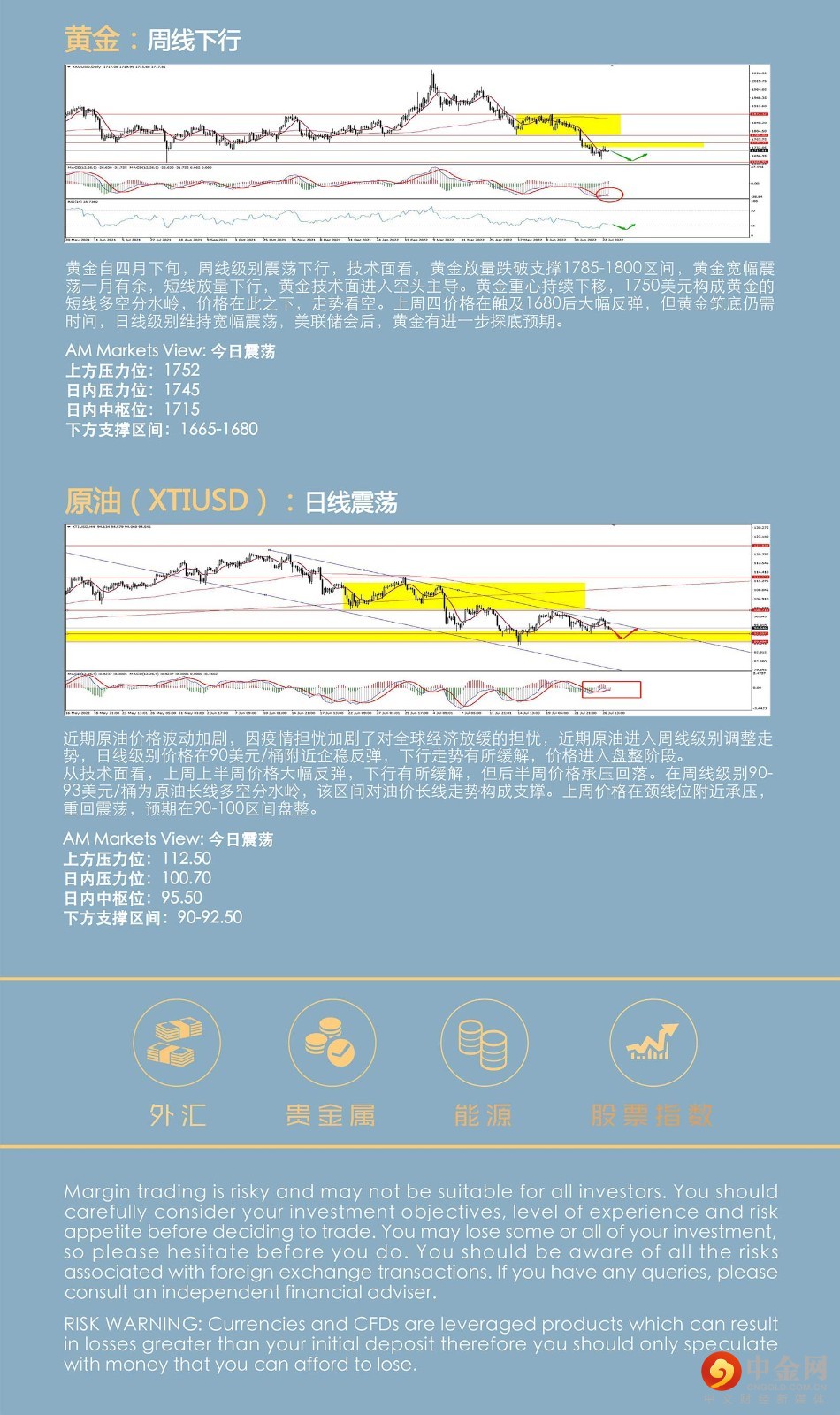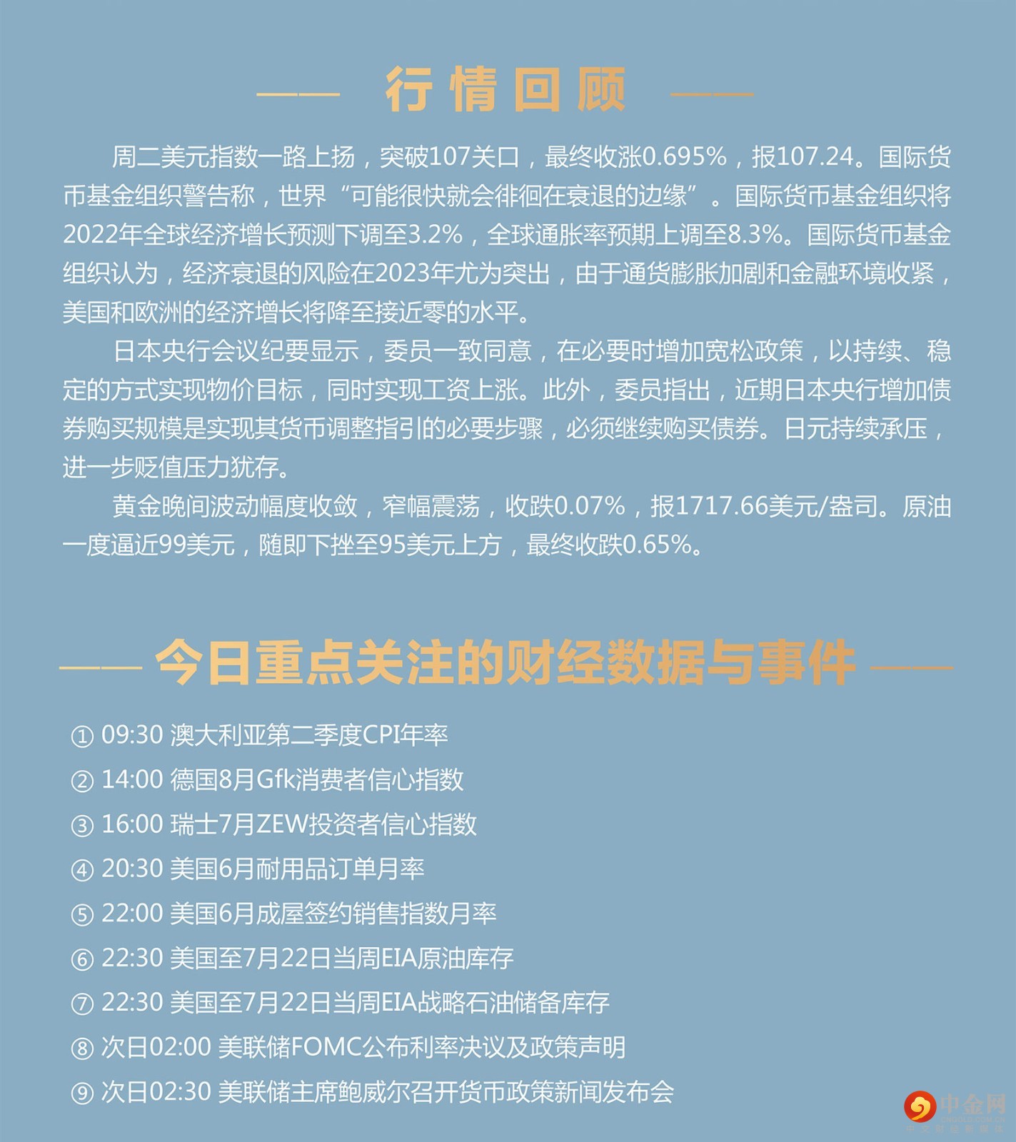 周二美元指数一路上扬,突破107关口,最终收涨0.695%,报107.24。国际货币基金组织警告称,世界“可能很快就会徘徊在衰退的边缘”。国际货币基金组织将2022年全球经济增长预测下调至3.2%,全球通胀率预期上调至8.3%。国际货币基金组织认为,经济衰退的风险在2023年尤为突出,由于通货膨胀加剧和金融环境收紧,美国和欧洲的经济增长将降至接近零的水平。 日本央行会议纪要显示,委员一致同意,在必要时增加宽松政策,以持续、稳定的方式实现物价目标,同时实现工资上涨。此外,委员指出,近期日本央行增加债券购买规模是实现其货币调整指引的必要步骤,必须继续购买债券。日元持续承压,进一步贬值压力犹存。 黄金晚间波动幅度收敛,窄幅震荡,收跌0.07%,报1717.66美元/盎司。原油一度逼近99美元,随即下挫至95美元上方,最终收跌0.65%。
