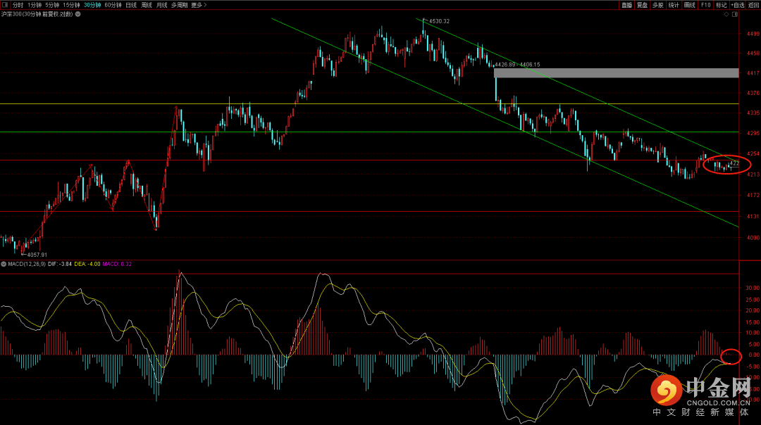 沪深300依旧受制于三十分钟的下降趋势线压制,在没有突破之前大概率不会有太大的反弹空间出现,而下方重点关注4186点支撑,一旦跌破就可能出现下跌扩张走势,这段下跌注意把控好低吸机会大概率会再次回升。