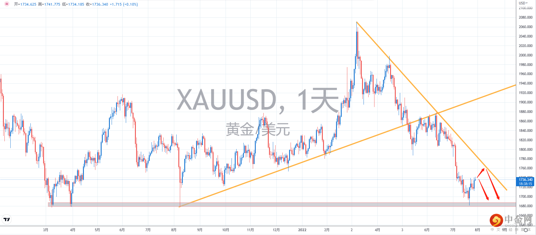 【技术点评】:D1周期,黄金价格延下降趋势线震荡下行,本周重点考虑逢高做空。