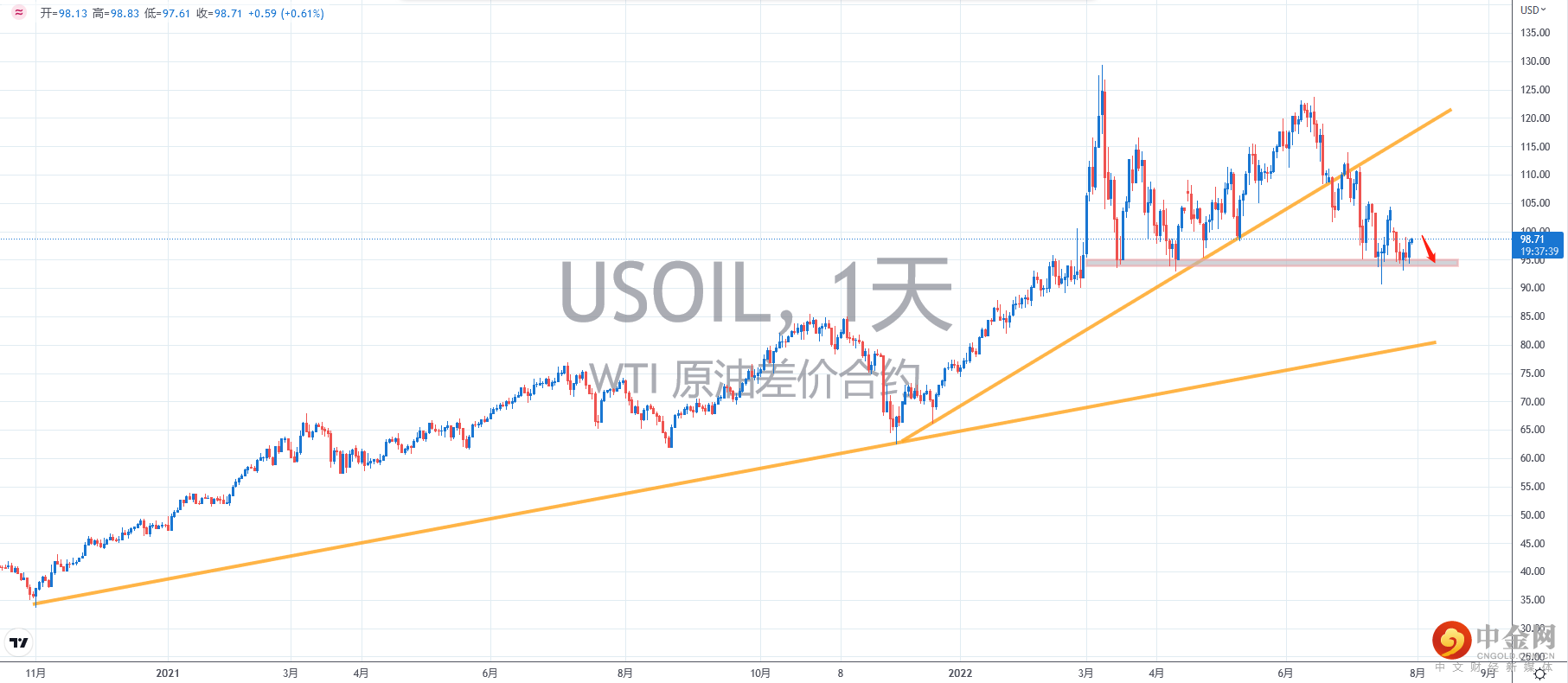 【技术点评】:D1周期,原油持续数日测试水平支撑位,本周大概率继续试探。