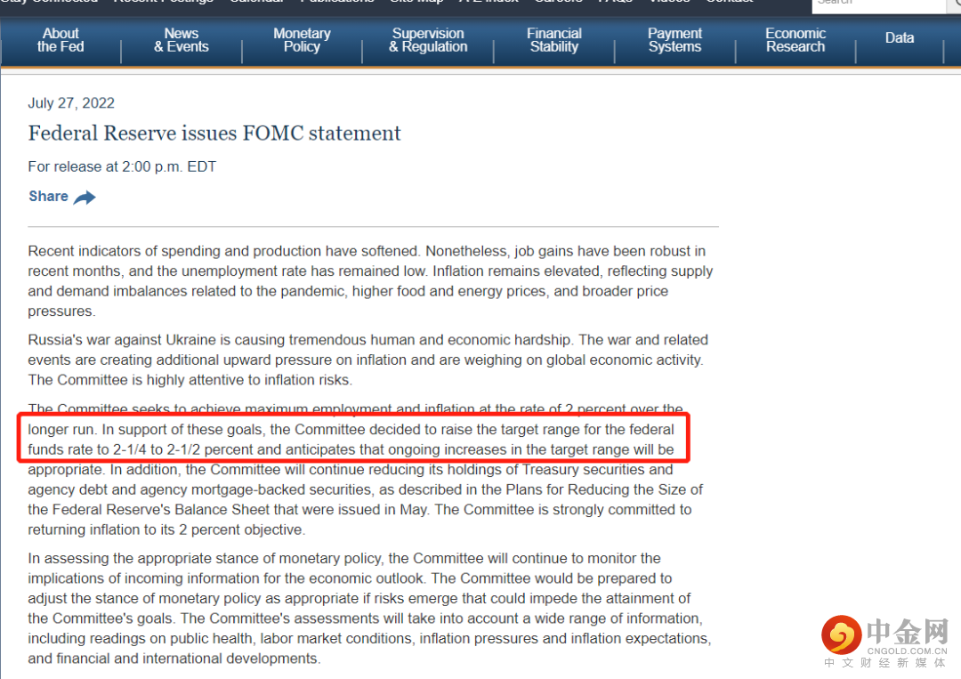 会议声明中,美联储宣布年内第4次加息,加息幅度达75个基点,将联邦基金利率提高至2.25%至2.5%的水平。这使得6~7月累计加息达到150个基点,幅度为1980年代初保罗-沃尔克执掌美联储以来最大。