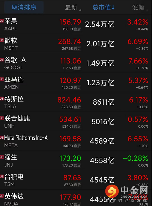 盘面上看,在谷歌和微软业绩报告提振情况下,大型科技股普涨。谷歌、英伟达涨超7%,微软、特斯拉涨超6%,亚马逊涨超5%,苹果、台积电涨超3%。微软市值重新站上2万亿美元,苹果市值则回到2.5万亿美元上方。据悉,谷歌二季度营收696.9亿美元,同比增长13%;微软上财季营收达518.7亿美元,同比增长12%。