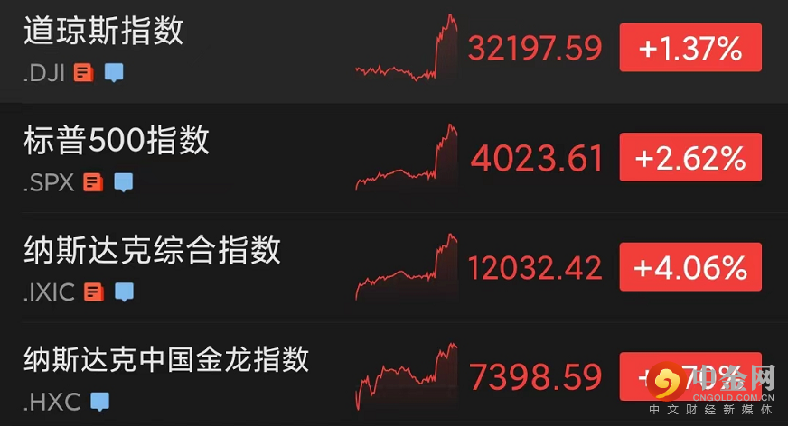 美股三大指数当天集体收高,大型科技股迎来“狂欢”之夜。道指涨1.37%,标普500指数涨2.62%,纳斯达克指数涨4.06%,创2020年4月以来最大单日涨幅。