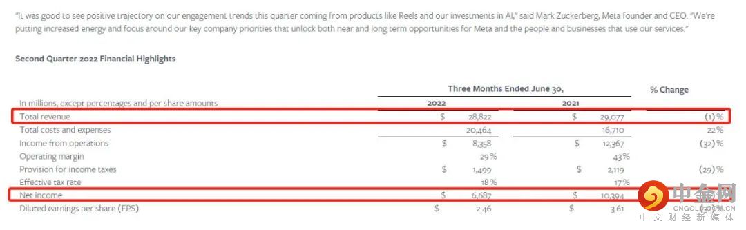 不过,美股盘后Meta的财报不甚理想。公司第二财季营收288.2亿美元,同比下降1%,当季营收首次出现同比下滑;净利润66.87亿美元,同比下滑36%。其中,第二季度广告业务收入281.52亿美元,去年同期为285.8亿美元。Meta股价盘后一度跌超6%,目前跌幅已收窄至超4%。