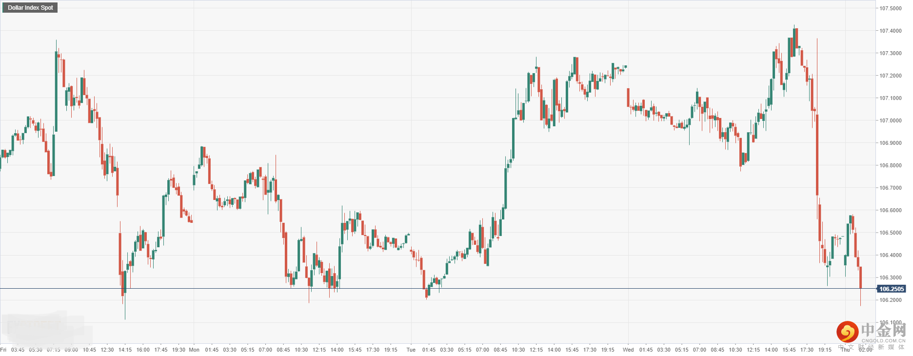 美元指数周三收盘大幅回落后,今日开盘跌0.72%至106.25附近,因美联储鲍威尔鸽派讲话,导致美元下行震荡疲软。