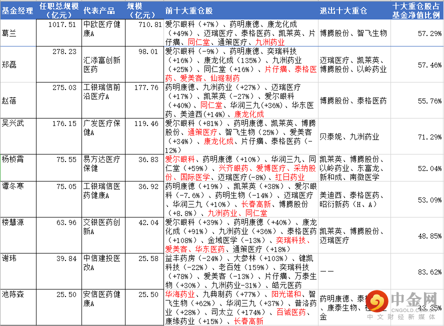 葛兰、郑磊、赵蓓、吴兴武、杨桢霄、谭冬寒、楼慧源、谢玮、池陈森等9名基金经理有着非常清晰的“医药”标签,至二季度末,他们合计管理规模超过2000亿元,在医药投资领域有着举足轻重的作用。