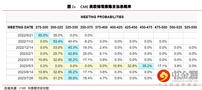 CME“美联储观察”显示市场对未来加息幅度仍存分歧。FOMC声明后据CME“美联储观察”显示,美联储加息至2.75%-3.0%的概率由48.8%降至45.7%,加息至3.0%-3.25%的概率由43.1%升至47.2%。11加息至3.0%-3.25%的概率由37.5%降至36.9%,加息至3.25%-3.5%的概率由44.4%升至46.2%。美联储OIS掉期交易显示,12月联邦基金利率将达到3.4%,2022年剩余时间将累计加息107个基点。与FOMC声明前基本一致。