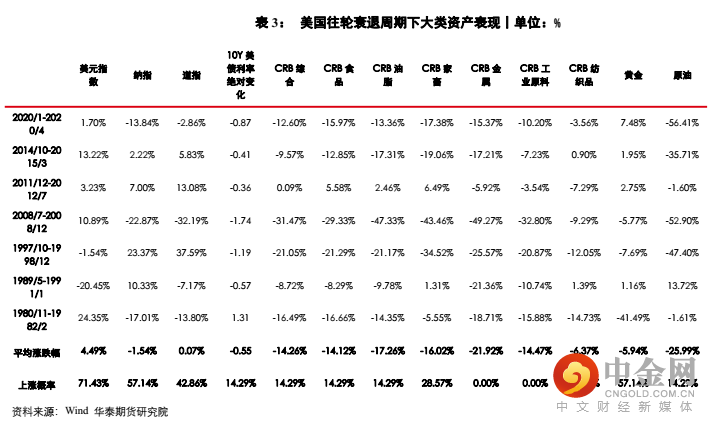 我们判断,短期而言,加息兑现后,风险资产迎来反弹窗口期;中期而言,衰退交易或仍是市场主旋律。通过复盘衰退时期的资产价格表现来看,一、股指表现较为中性,并非必然下跌,纳指上涨概率为57%,道指上涨概率为43%;二、商品下行概率较大,黄金相对抗跌,原油及其他主要商品上涨概率仅14%,黄金上涨概率超50%;三、美元指数易涨难跌,美债利率易跌难涨,美元上涨概率超70%,美债利率上涨概率仅14%。