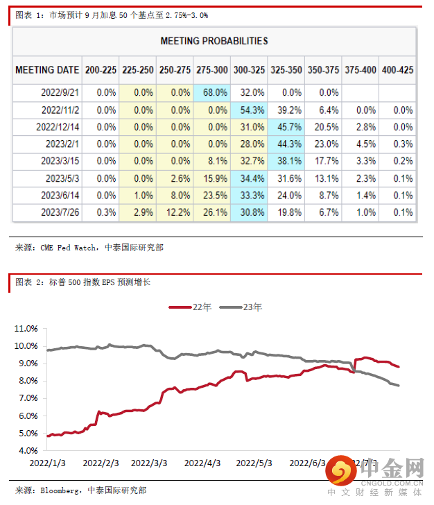 美联储在今晨的议息会议宣布加息75个基点,把联邦基金利率区间提升至2.25-2.5%,缩表规模在9月将提升至600亿美元国债及350亿美元MBS,符合市场预期。声明中提及近期消费和生产的趋弱,但强调就业市场依然强劲,美联储会坚定致力于让通胀回归其2%的长期目标,认为低于趋势水平的增长可能是降低通胀的必要条件,未来加息水平会视乎数据而定。我们认为本轮加息预期急速上升的阶段大概率已近尾声,美联储亦无意提高进一步急速加息的预期。尽管利率水平已升抵2018年的水平,并预计更高的利率会维持一段时间,但不论9月最终加息50或75个基点,从边际意义上,本轮加息循环及压力大概率在7月已见高峰,9月开始出现转折点,因此影响分母端(利率)的压力可望在三季度纾缓,接下来分子端(盈利下修)的压力会是影响美股的重要因素。