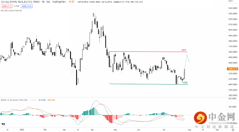 尽管出台了系列利好政策,6月房地产销售呈现回暖,但整体市场仍面临信心不足的情况。房地产指数仍呈现横盘走势。部分房企仍面临流动性风险,房价高企,低结婚率引发的购房需求不足。因此,房地产指数的整体趋势可能是在4600至4100之间横盘震荡。