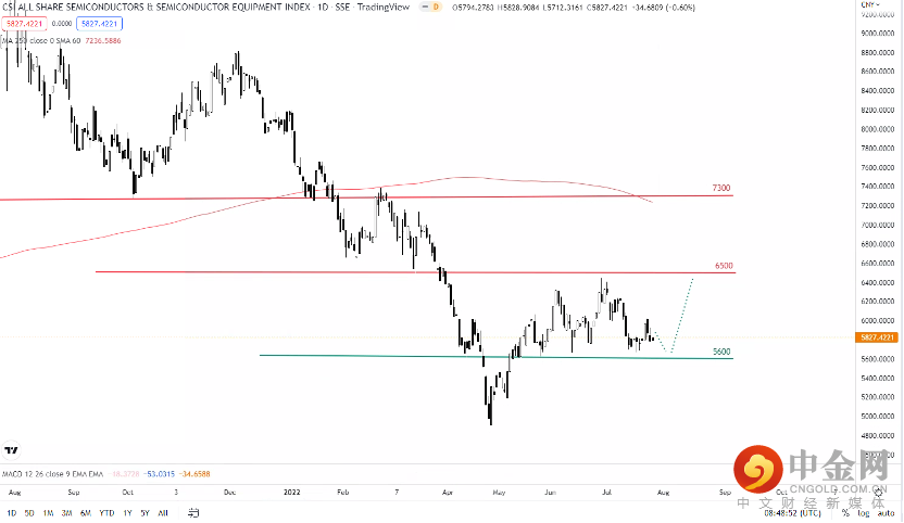 鉴于在政策的扶持下,新能源汽车的政策补贴和免购置税将延续到今年年底,销量出现大幅度增长,家用电器(空调)的消费在夏季持续高温的情况下可能会改善,这反过来会增加对芯片的需求。因此指数或面临企稳反弹,观察6500点的第一个阻力位。若实现突破,指数或进一步上行至7300附近。