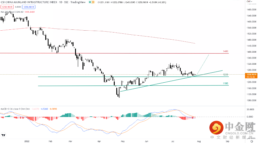 与其他板块相比,基础设施指数仍处于相对较低的水平,但该指数自2022年5月低点开始的中期上涨行情较为稳定,且估值无虚高。今年下半年,预计中国可能进一步增加基础设施投资,以帮助缓解失业情况,实现经济稳定增长的目标。短期支撑关注1235,若失守该位置有可能进一步回落至1180。中期上方目标可参考1400。