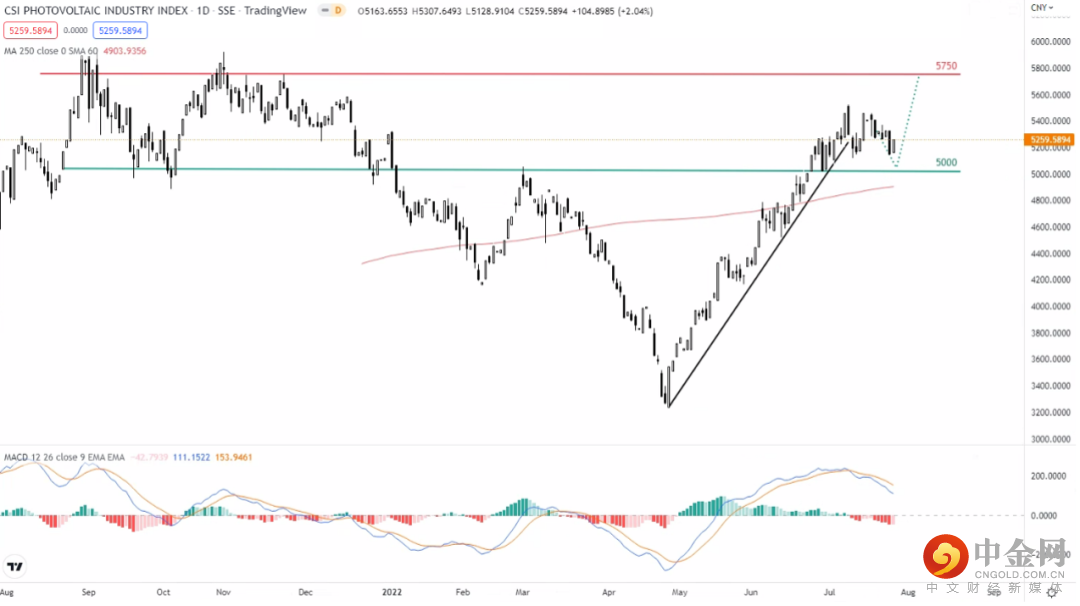 光伏产业指数的情形类似。第一阶段存在向5,000短期支撑位下行的短期回落风险。此后,则可能出现上涨行情并延伸至5,750阻力位。