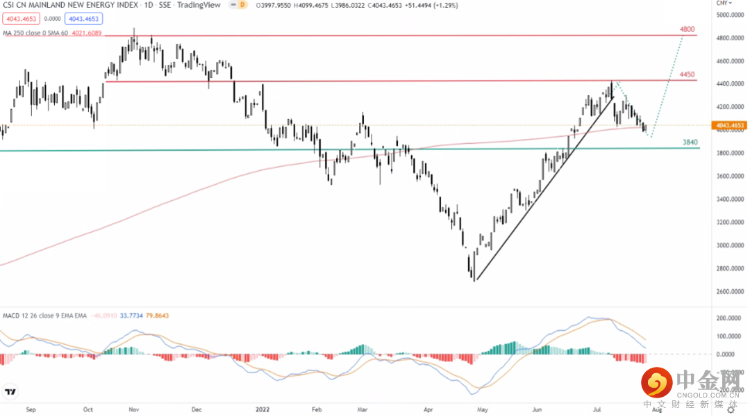 但是,MACD指标出现了空头背离信号,近期快速上涨的新能源指数持续面临短期回落的风险。关注价格是否能企稳在250日均线支撑4000点附近。若失守该点位,价格有可能面临进一步修复至中期支撑3840点,预计在此处将迎来二浪上行至去年高位4800附近。