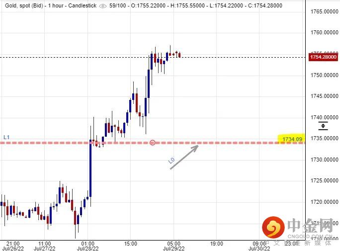 美国第二季度国内生产总值录得比预期为差的萎缩0.9%,由于已经是连续两季录得经济收缩,技术性上而言,美国已经步入经济衰退。尽管包括美国总统拜登在内等财金官员及机构都异口同声表示,现时美国未有步入衰退的境地,但技术性衰退氛围的影响下,投资者对联储局在9月份有机会放慢加息幅度的预期有望逐步升温,对追入黄金的风险承受意欲有推动作用,对金价短期间向上试探$1,765美元至$1,773元附近的障碍,应会构成正面的推动。故此,短线适宜建立黄金好仓盘,看好金价可以承接加息担忧情绪减少,所带出的回升动力。