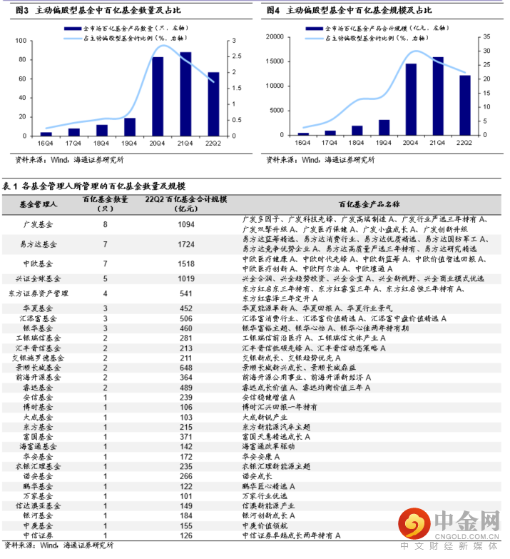 正是因为公募基金行业迎来大发展,所以市场也见证了多只“百亿基金”的诞生。本文所称百亿基金是指存续主动偏股型基金中,单只基金产品的管理规模(各类份额合并计算)达到了100亿以上的基金产品。2019年百亿基金数量还不足20只,占全部主动偏股型基金数量的0.8%,合计规模仅为3145亿元,占全部主动偏股型基金规模的14.5%;而2020年则达到了83只,占全部主动偏股型基金数量的2.8%,合计规模近1.5万亿元,占全部主动偏股型基金规模的29.6%。这也就意味着,公募基金出现头部化现象,少数规模较大的基金占据了较大的份额,这可能也跟居民在购买基金时往往选择热门产品有关。2021年百亿基金数量和规模进一步增长,但是今年上半年A股市场出现较大幅度的下跌,公募基金整体规模有所下滑,所以百亿基金数量也相应减少至22Q2的67只,占全部主动偏股型基金数量的比例下滑至1.7%,规模下降至22Q2的1.2万亿元,占全部主动偏股型基金数量的比例下滑至22.4%。