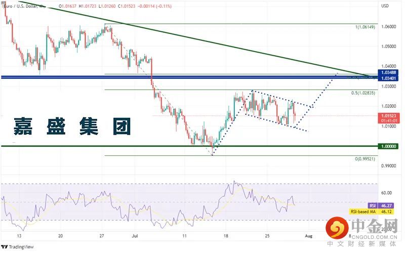 欧元/美元4小时图触及6月27日高点到7月14日低点行情的50%回档位1.0285,目前似乎在构筑旗形形态。第一阻力位在旗形上轨下降趋势线1.0215附近,攻克则可望摸至7月21日以来高点兼50%回档位1.0283。下个阻力位是由强水平阻力、前述行情的61.8%回档位和旗形目标构成的阻力带1.0340/1.3050。但如果价格下破,第一步可能下看旗形底部1.0085附近,然后下探7月14日低点0.9952。