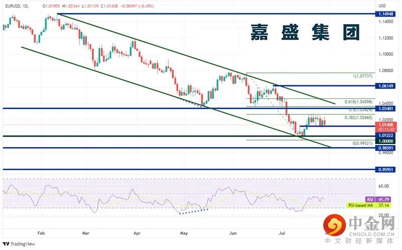 欧元/美元2月以来不断下行并形成下降通道,7月14日下破通道下轨趋势线,最低到达0.9952,旋即回升,至2月10日高点到7月14日低点行情的38.2%回档位,即1.0266附近。7月19日以来,该货币对一直在由水平支撑位1.0122和38.2%回档位1.0266构成的区间内交投。现在准备突破吗?