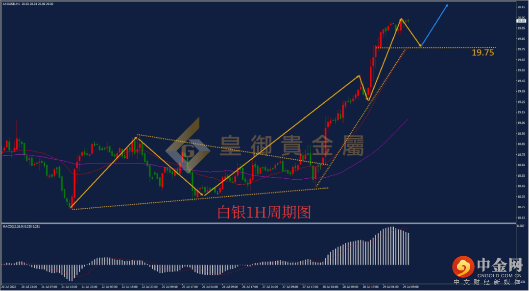 隔夜公布了美联储利率决议,鸽派加息利多金银后,昨天公布的美国GDP数据,再次出现不乐观,根据美国商务部数据显示,美国二季度实际GDP年化季环比初值-0.9%,低于预期0.4%,前值为-1.6%,表明连续两个季度出现萎靡。消息公布后,黄金稳步拉升,从1737.0支撑位附近上涨至1756.6附近,涨幅接近20美金,白银延续上涨趋势,最高上探至20.00美元/盎司整数关口上方。