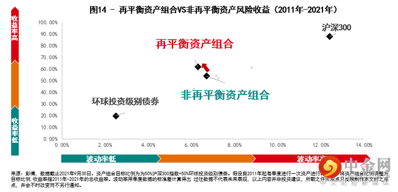 历史数据表明,再平衡策略是一种能够有效降低波动风险并且改善收益的投资策略。如图14所示,我们构建了一个50%投资于沪深300指数,50%投资于全球投资级别债券的组合。假设我们以2011年作为起点,并且每季度进行一次资产的再平衡。通过历史回测数据可见,使用了再平衡策略的资产组合2011年—2021年间总收益率为62%,波动率为6.3%。相较于同期未使用再平衡策略的投资组合,再平衡投资组合的收益率有所提高,而波动率却降低了。由此可见,再平衡策略可以在降低波动的同时改善收益,是提高风险调整后回报的利器。