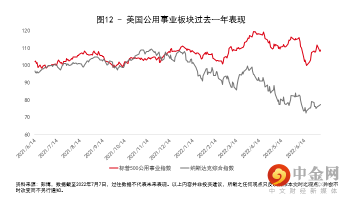 而从行业的维度去看,与上文提到的“美林时钟”大类资产配置的逻辑相类似,不同的行业在不同经济周期中的表现也大相径庭。如图12所示,美国公用事业板块在过去一年录得了约9%的收益,而同期代表科技行业的纳斯达克指数,回撤幅度高达23%。原因是公用事业行业作为防御性板块,由于其市场需求稳定,经营受经济环境影响相对较小,再加上其支付股息的能力普遍较为出色,因此往往在经济下行的环境中表现相对较好。