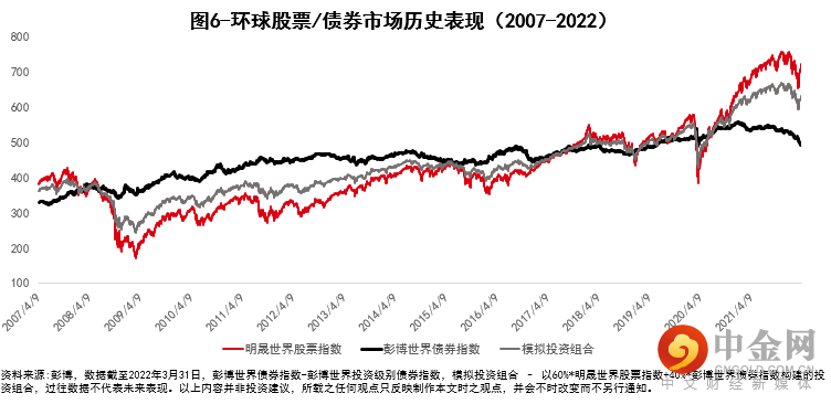 而从波动控制的角度来说,资产组合相对单一类别资产可以在获得相对不错收益的同时,有效降低波动率。我们以股债多元组合为例(图6),在过去15年中,红色线条代表的全球股票指数的年化波动率约为16.8%。假设我们建立一个60%世界股票、40%世界债券的投资组合(图6灰色线条代表),相较于单一的股票资产波动率将大幅降低至9.6%,而15年间总收益则为73%,与持有单一股票资产所获得的86%的收益相差并不大。因此,对于寻求均衡收益的环球投资者来说,多元资产组合是一个颇具性价比的选择。