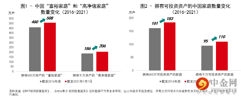 根据《2021胡润财富报告》最新发布的数据显示,截至2021年,不论是中国“富裕家庭”和“高净值家庭”的数量,还是拥有600万和千万可投资资产的家庭数量,都比五年前有了10%以上的增长。