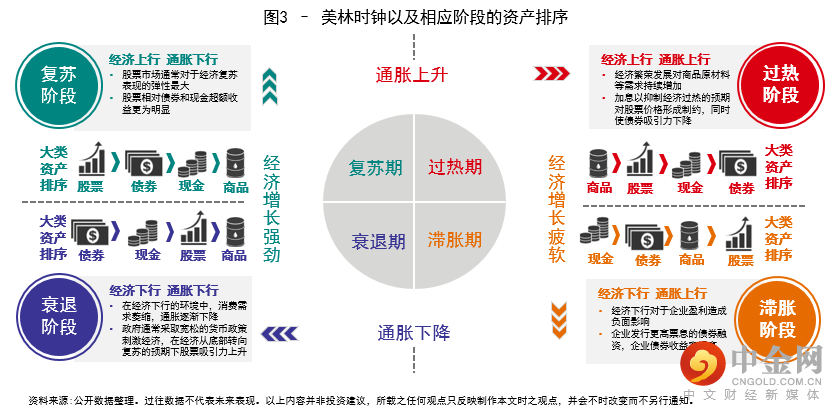 如图3所示,“美林时钟”通常会根据两个最主要的衡量宏观经济状况的指标——经济增长率和通货膨胀率(也就是GDP和CPI)将一个完整的经济周期划分为四个阶段,分别是复苏期,过热期,滞胀期和衰退期。由于一个完整经济周期的不同阶段有着不同的特性,所以每个时期大类资产的配置重点也有所不同。