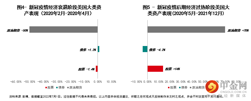 我们以新冠疫情期间,经济衰退和经济过热阶段,美国大类资产表现为例,来说明经济周期的不同阶段对大类资产表现有何影响。