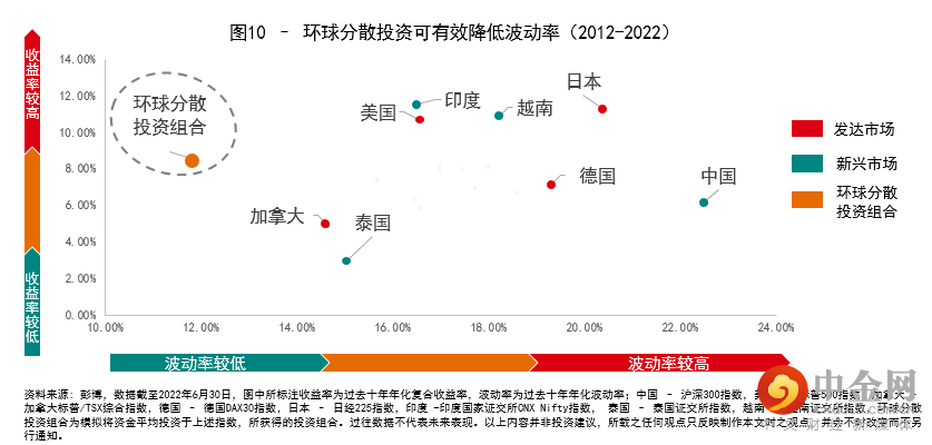 那么分散投资于不同国家和地区的有效性究竟如何?我们可以通过下面这张图得出结论。如图10所示,我们选取了过去十年表现较好的4个发达市场以及4个新兴市场,并计算它们从2012年至今的十年年化收益率以及波动率。同时,我们假设将资金平均投资于所选取的8个市场中,来建立一个模拟的环球分散投资组合。从图中我们可以看到,模拟投资组合的10年年化收益率大约为8.63%,表现在所选取的8个市场中介于中间位置;而它的最大优势是它的年化波动率与所选取的所有市场相比最低,因此也就获得了最高的夏普比率 ——这也就意味着相比这8个市场,对于我们所承担的每一份风险,模拟投资组合可以带来更高的收益。由此可见,环球分散投资对于降低投资组合的波动率效果显著。