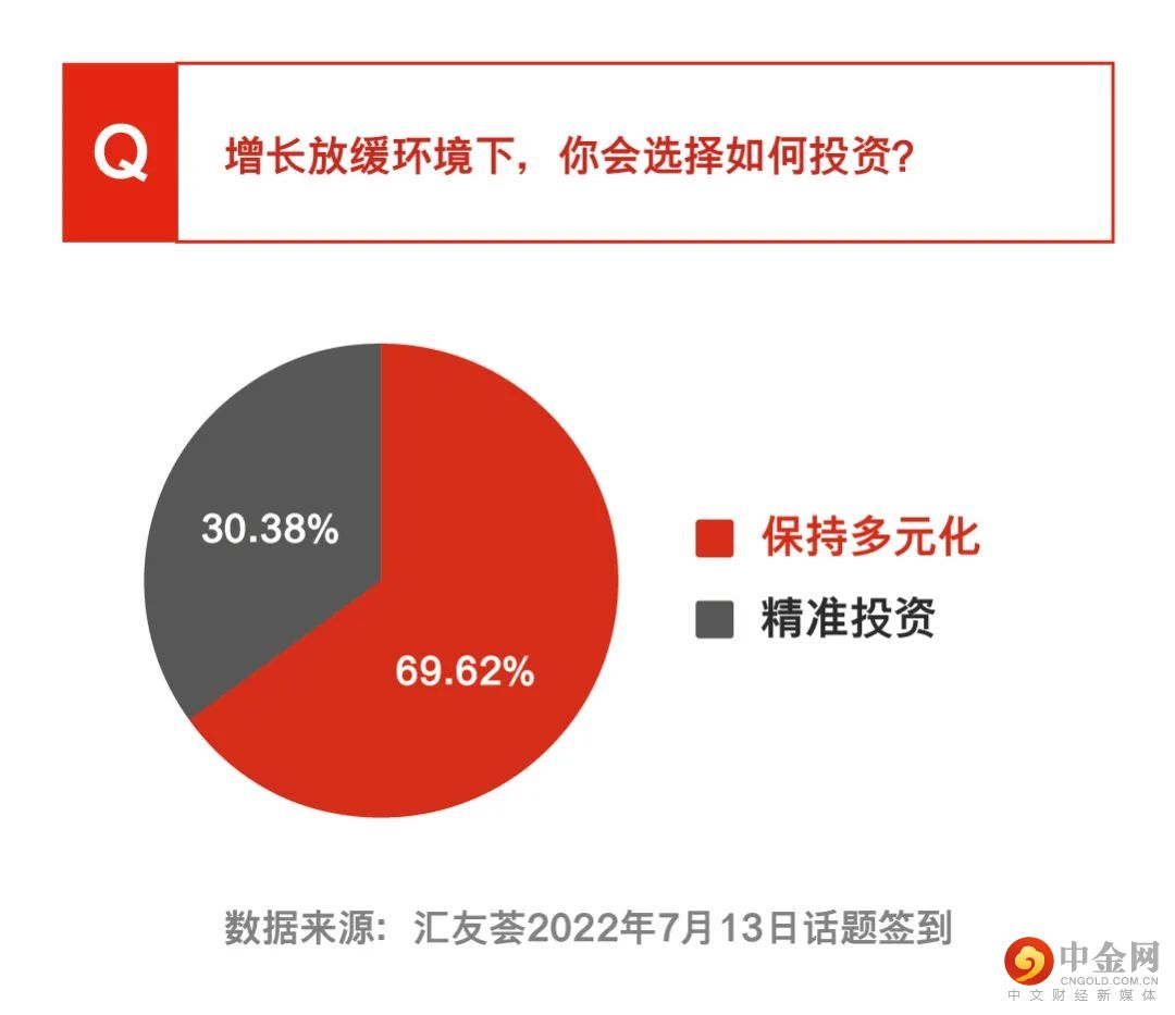 实际上,投资的方法、产品和渠道多种多样,想要获得收益甚至高回报,关注市场经济情况,目光不仅是放在我国经济环境,更要放眼于世界大局。尤其在现在全球经济增长放缓的情况下,整个2022的投资市场都充满了挑战,我们该不该持续投资,如何在下半年把握投资机遇,都是至关重要的问题!在过往的调查中,69.62%的受调查者认为增长放缓环境下,会选择保持多元化的投资,30.38%的受调查者认为应该注重精准投资。