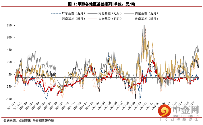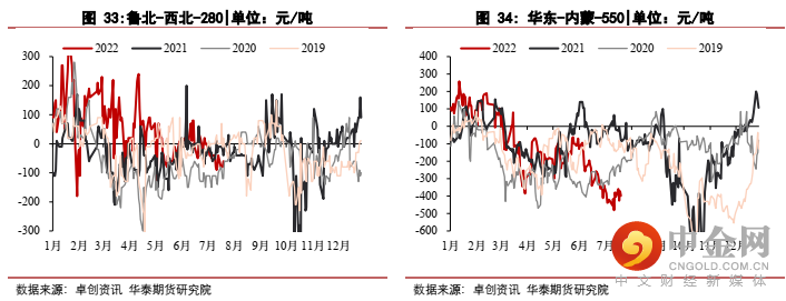 上图近月基差跳空换月对标09合约。(1)太仓-09期货的基差从7月初的-60元/吨走强到7月底的0元/吨,负基差的走强一方面是盘面的下挫,另一方面是外盘开工率下降引起后续港口改善预期,且回流内地窗口一度打开,提振港口基差。(2)内地方面,7月煤头检修增加,传统下游淡季开工下降偏慢,内地基差偏强。