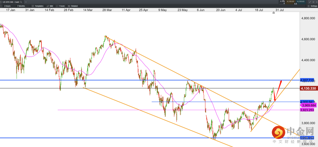 标普500指数自7月19日以来突破3750 – 3930的底部震荡区间后维持震荡上行结构,目前形成了4小时的震荡上行趋势。策略仍维持逢低看多。上方目标价为4200整数关口。考虑到美联储主席鲍威尔在7月会议上对9月的政策指引模糊不清,9月可能加息75bps或50bps。由于市场缺乏进一步指引,多头投资者短期情绪或转向谨慎。因此,更倾向于寻求市场的回调买入机会。关注下方4000的整数支撑,该位置为4小时上行趋势线的支撑处。