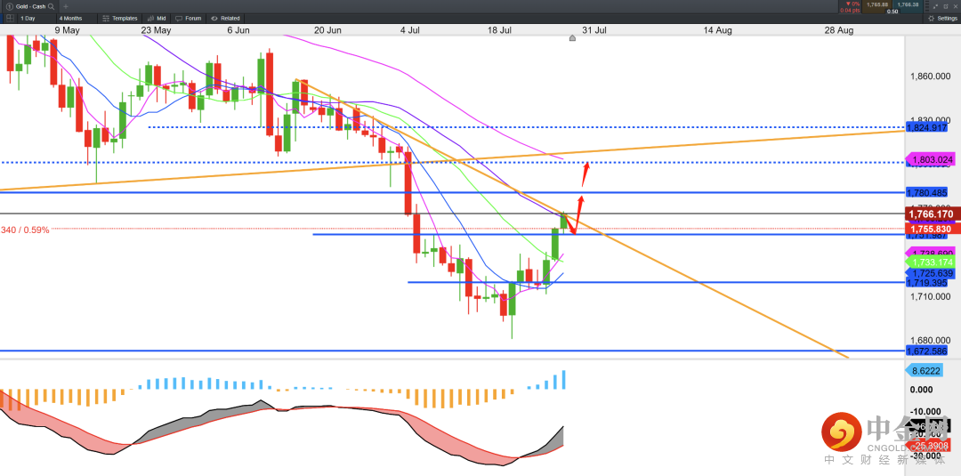 黄金上周走出了我们预期的反弹行情,从目前结构上看,金价正挑战日线级别的下行趋势压力线。若价格能成功突破该水平并企稳,价格或进一步上行至1780,然后是60日均线压力1800。若价格陷入短期修正,价格或回落至1750支撑。MACD指标呈现金叉背离,趋势上更倾向于逢低看多的思路。