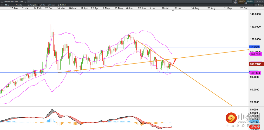 WTI原油上周基本符合我们底部震荡反弹的判断,并触及此前日线结构的趋势线压力处103附近。考虑到本周欧佩克+会议或不会出现超预期的增产计划,原油本周或继续维持震荡反弹趋势。目前短期关注价格能否突破104成功回到上行结构中,若价格成功突破,则可能进一步延伸至108-110。MACD指标目前有底部金叉迹象。